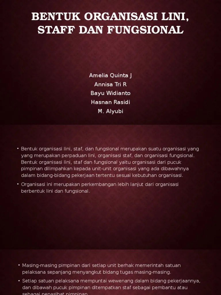 Bentuk ini ditemukan oleh f.w. Organisasi staf adalah suatu bentuk organisasi yang hanya mempunyai . Disini pimpinan tidak mempunyai bawahan. Bentuk organisasi lini, staf dan fungsional. Struktur organisasi adalah bentuk struktur yang ada di perusahaan.