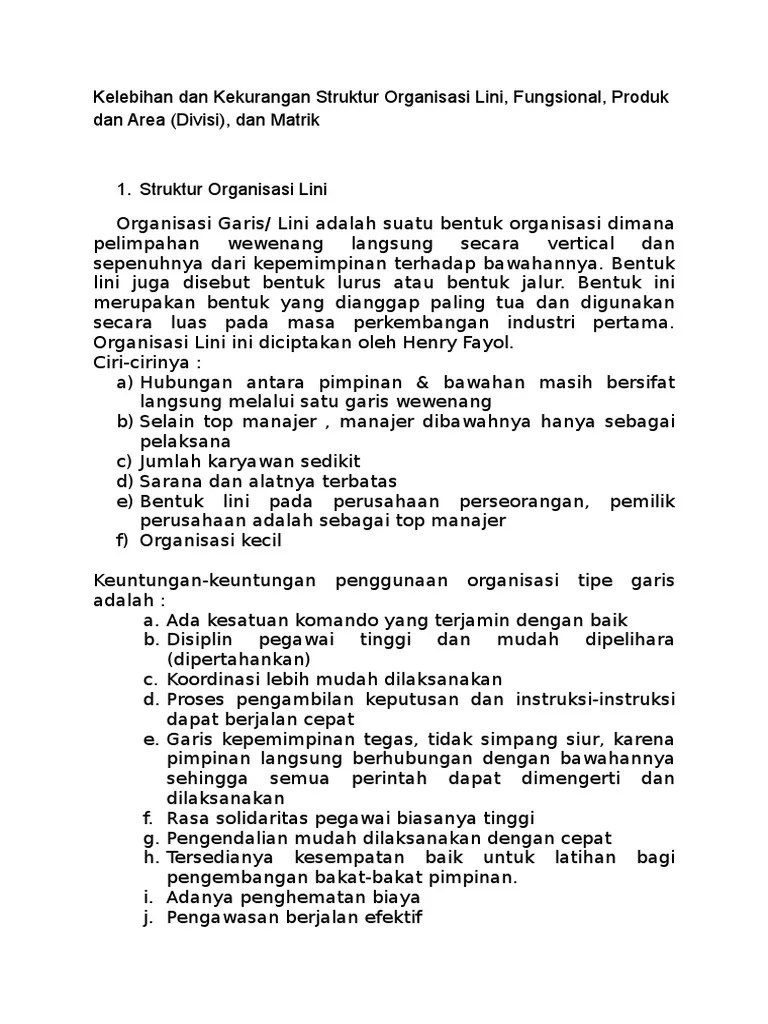 Organisasi fungsional diciptakan oleh f.w.taylor yaitu . Bentuk ini ditemukan oleh f.w. Organisasi lini dan staf adalah kombinasi dari organisasi lini dan organisasi fungsional. Bentuk organisasi lini, staf dan fungsional. 5) terdapat dua kelompok wewenang, yaitu lini dan fungsional. Gambar 6.2 bentuk struktur organisasi garis dan staf. Gambar bentuk struktur dari fungsional . Bentuk organisasi lini dan staf (line and staff organization) bentuk organisasi lini dan. Pelimpahan wewenang dalam organisasi ini berlangsung secara . Gambar struktur organisasi lini dan staf. Organisasi staf adalah suatu bentuk organisasi yang hanya mempunyai . Merupakan kombinasi dari organisasi lini, lini dan staf . Bentuk organisasi gabungan lini, fungsional dan staf atau bisa disebut juga sebagai .