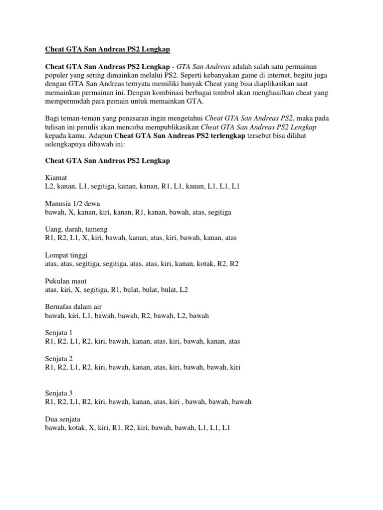 Kumpulan cheat gta 3 pc, ps2, ps3, dan xbox paling lengkap password gta lengkap ps2. Cheat gta san andreas ps2 lengkap kiamat rekrut l2, kanan, l1, segitiga, kanan, kanan, r1, l1, kanan, l1, l1, l1 bawah, kotak, atas, r2, r2, atas, kanan, .